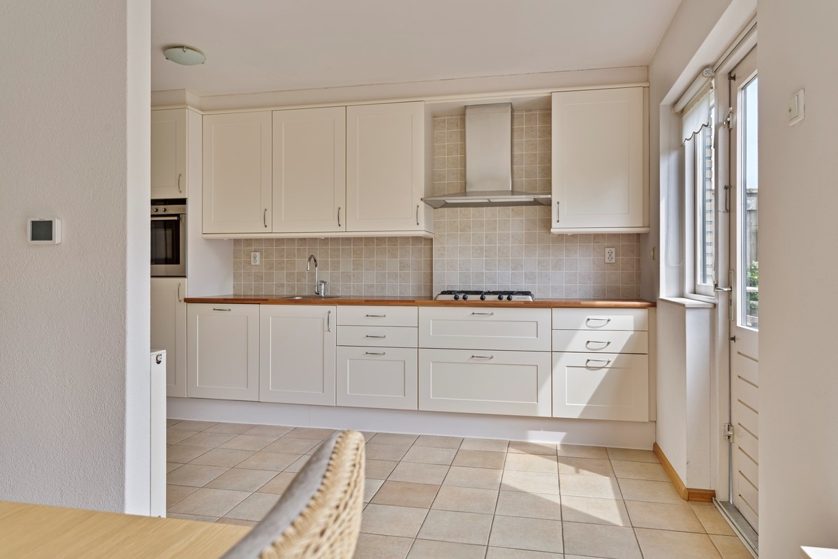 In de hal bevindt zich de meterkast, de garderoberuimte en de toiletruimte. Vervolgens loopt u door naar de keuken en de woonkamer. Omdat de begane grond aan de achterzijde is uitgebouwd, treft u een grote keuken en woonkamer aan. De keuken is voorzien van veel kasten en inbouwapparatuur zoals een combi-oven/magnetron, een vaatwasser, een koelkast en een vijf-pits gasfornuis met afzuigkap. De woonkamer heeft een eetgedeelte en een zitgedeelte. Het zitgedeelte bevindt zich aan de voorzijde en vanaf hier heeft u vrij uitzicht op de voortuin en straat. Vanaf het eetgedeelte kijkt u mooi uit op de zorgvuldig aangelegde achtertuin. Het elektrische zonnescherm zorgt hier voor een aangenaam comfort tijdens de zonnige zomerdagen.