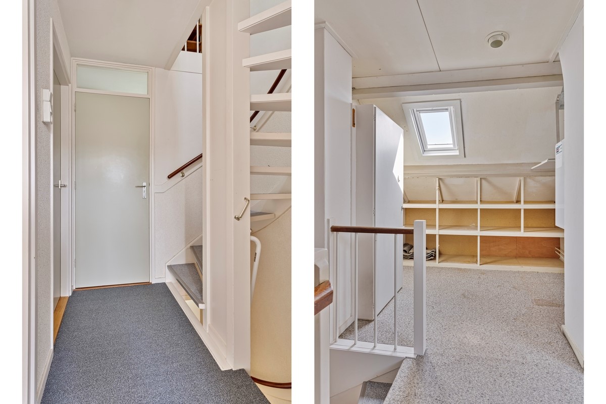 De tweede verdieping is te bereiken via een vaste trap en heeft een voorzolder en een slaapkamer. Op de voorzolder (met klein dakraam) bevinden zich de witgoedaansluitingen en de CV-ketel (Vaillant, 2017). Ook is hier sprake van veel bergruimte. De slaapkamer is erg ruim omdat er aan de achterzijde een groot dakkapel is geplaatst zodat er veel extra ruimte is gerealiseerd. Daarnaast is deze slaapkamer ook erg licht door de aanwezigheid van een dakraam. De twee dakramen op deze verdieping zijn in augustus 2023 geplaatst.